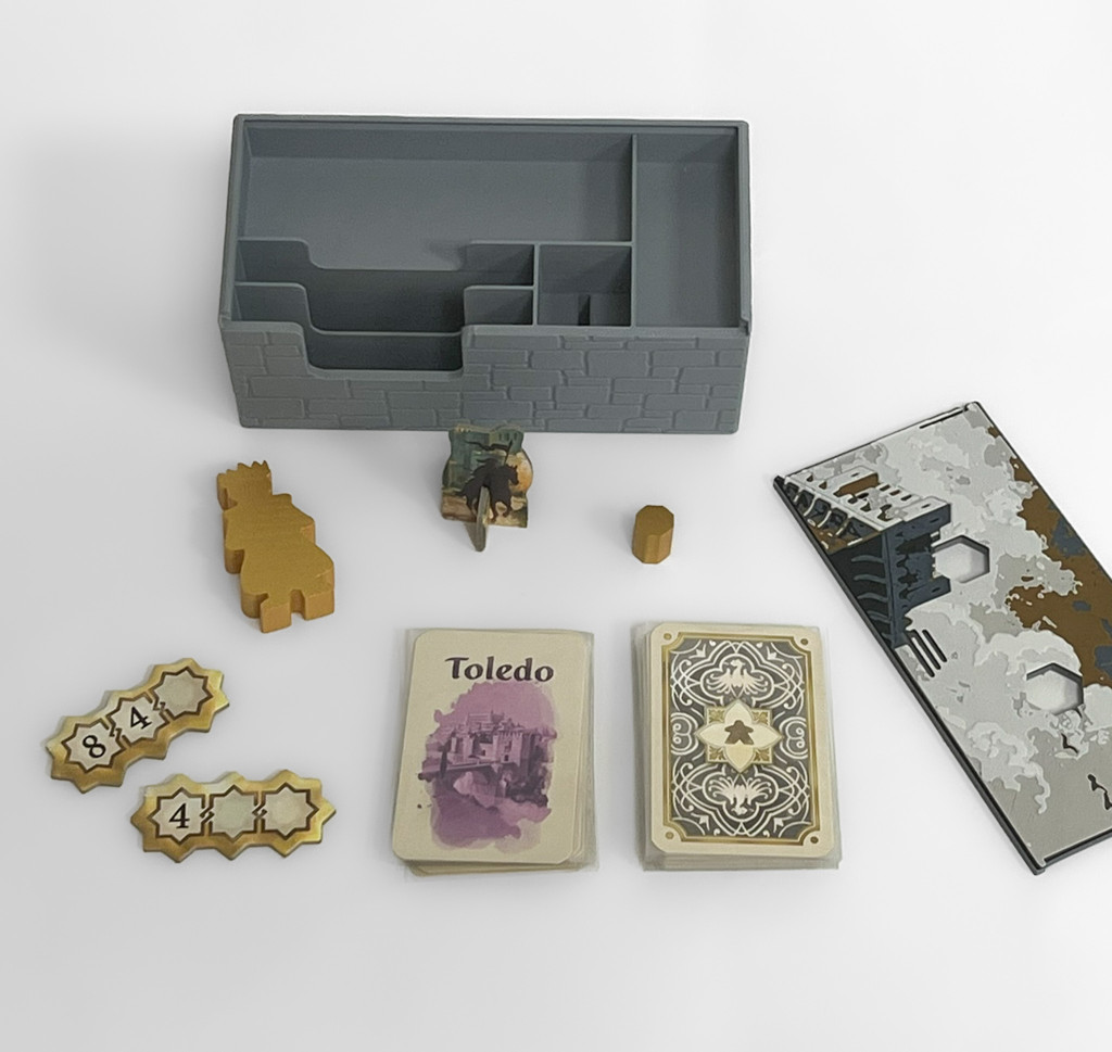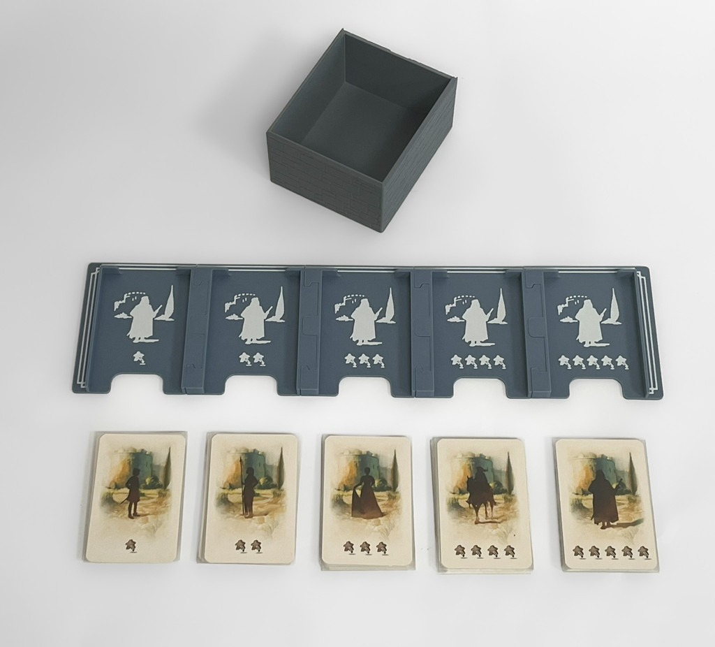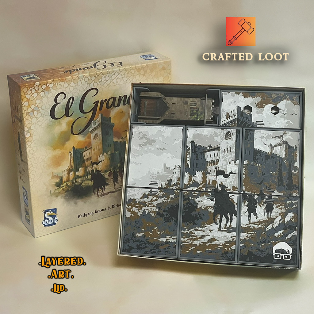 This 3D-printed insert is designed for the new 2023/2024 edition of El Grande, featuring unique and eye-catching Layered Art Lid covers. Thanks to its distinctive design, it stands out from traditional organizers. The practical layout allows for faster setup and a smoother, more enjoyable gameplay experience.